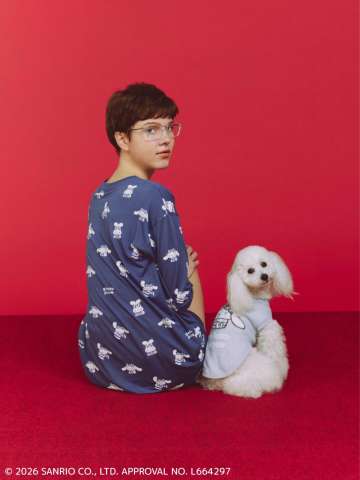 また、ヘアバンド&ルームウェアでリラックスしたシナモロールデザインのセットアップも発売★こちらも肌当たり柔らかなスムーズィー素材で提案しています。同じデザインの猫&犬向けスムーズィープルオーバーもラインナップ★